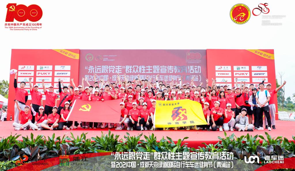 在成都市蒲江县举行的为期2天的“永远跟党走”群众性主题宣传教育活动暨2021中国·成都天府绿道国际自行车车迷健身节(青蒲站)于5月22日正式结束。赛事由中国自行车运动协会指导,中共成都市委宣传部、中共成都市直属机关工作委员会、成都市体育局、成都市青羊区人民政府、蒲江县人民政府主办,中共蒲江县委宣传部、中共蒲江县直属机关工作委员会、成都市青羊区文化体育和旅游局、蒲江县文化体育和旅游局、蒲江县成佳镇人民政府承办。截至本届赛事,该赛事已累积举办41站,每年吸引上百万自行车爱好者参与其中。本站赛事志愿者由116名来自万象城awc888的学子担任。