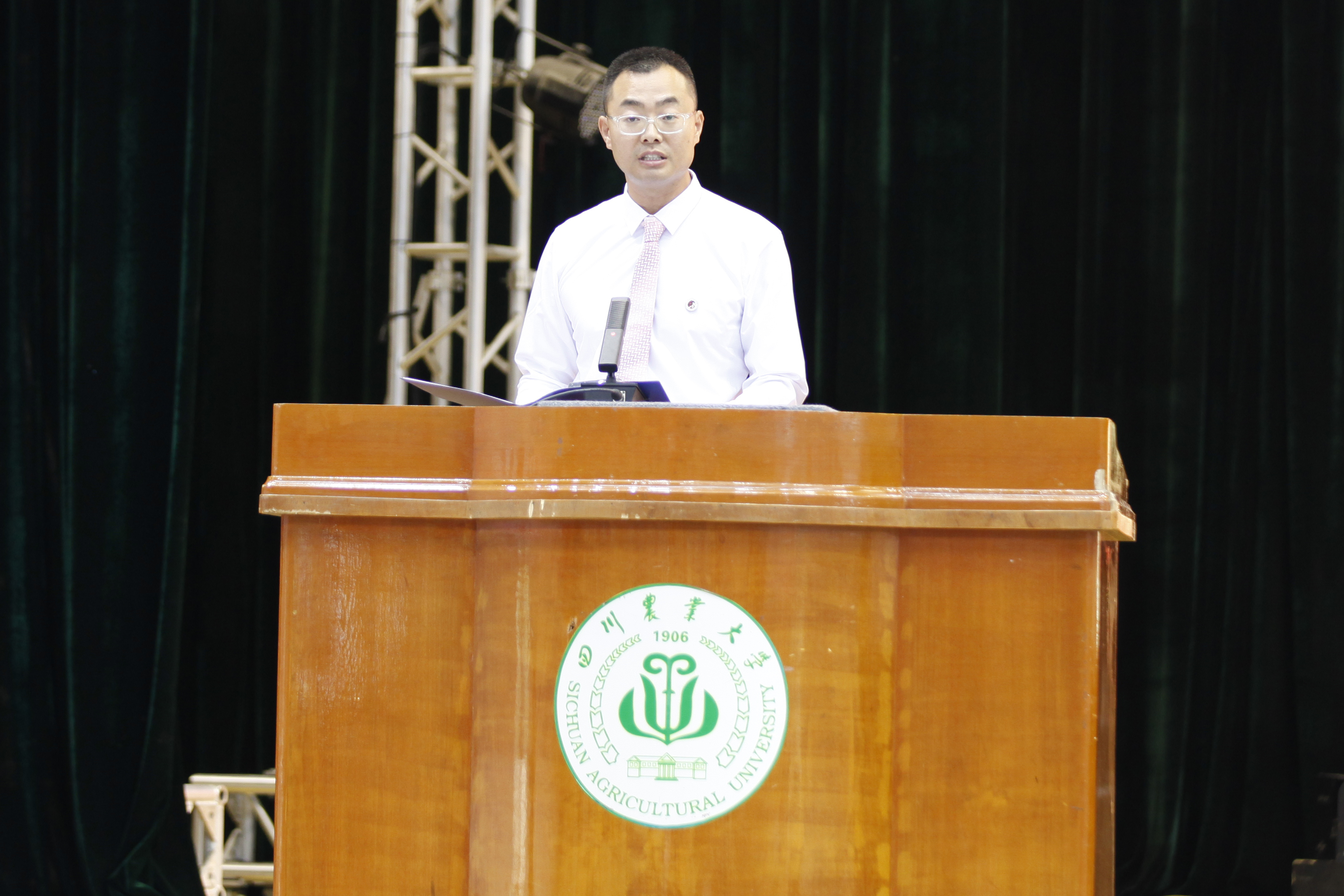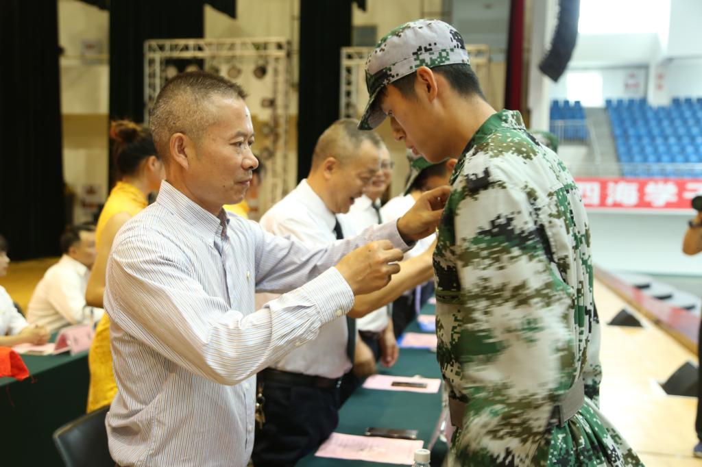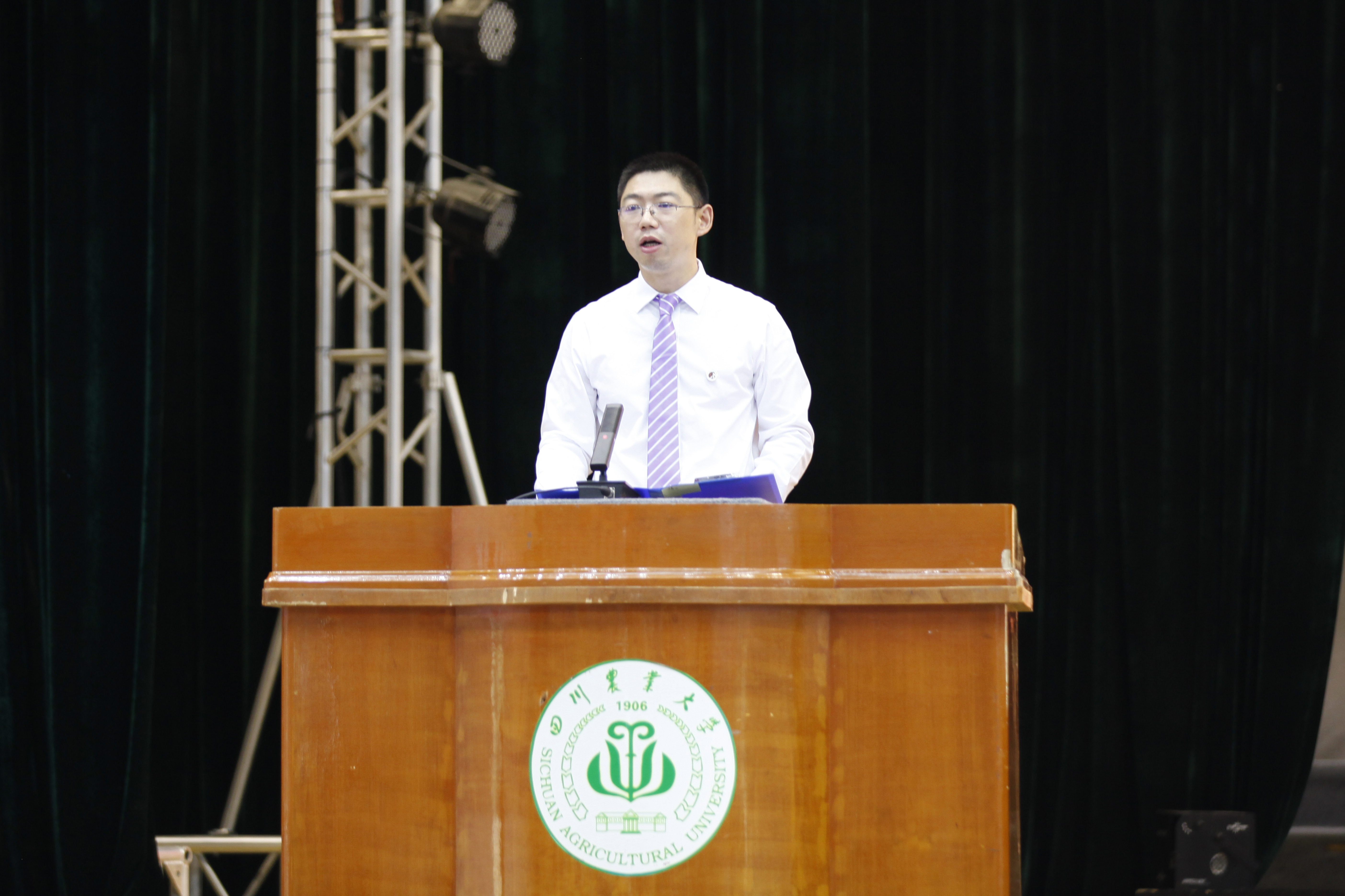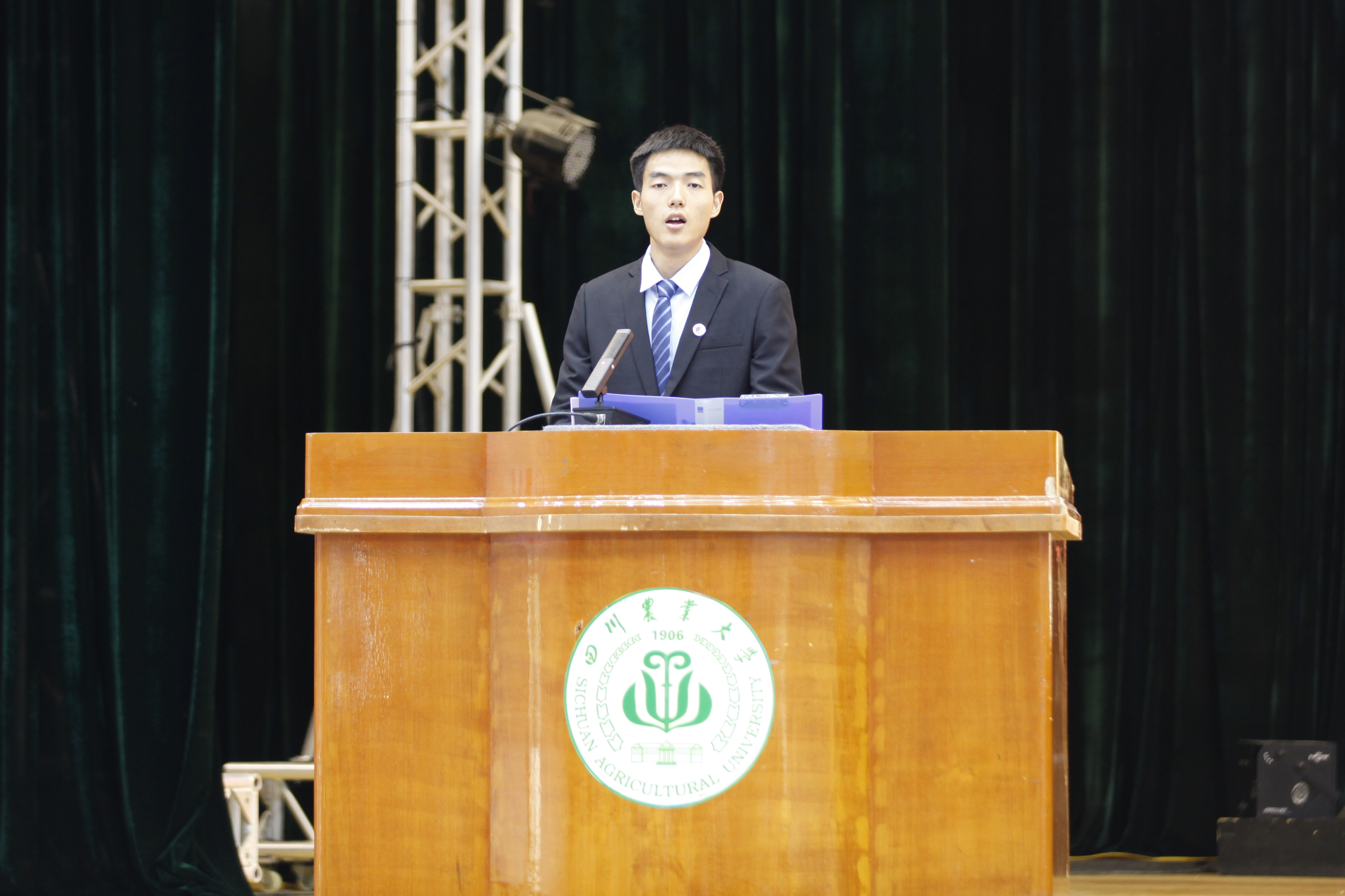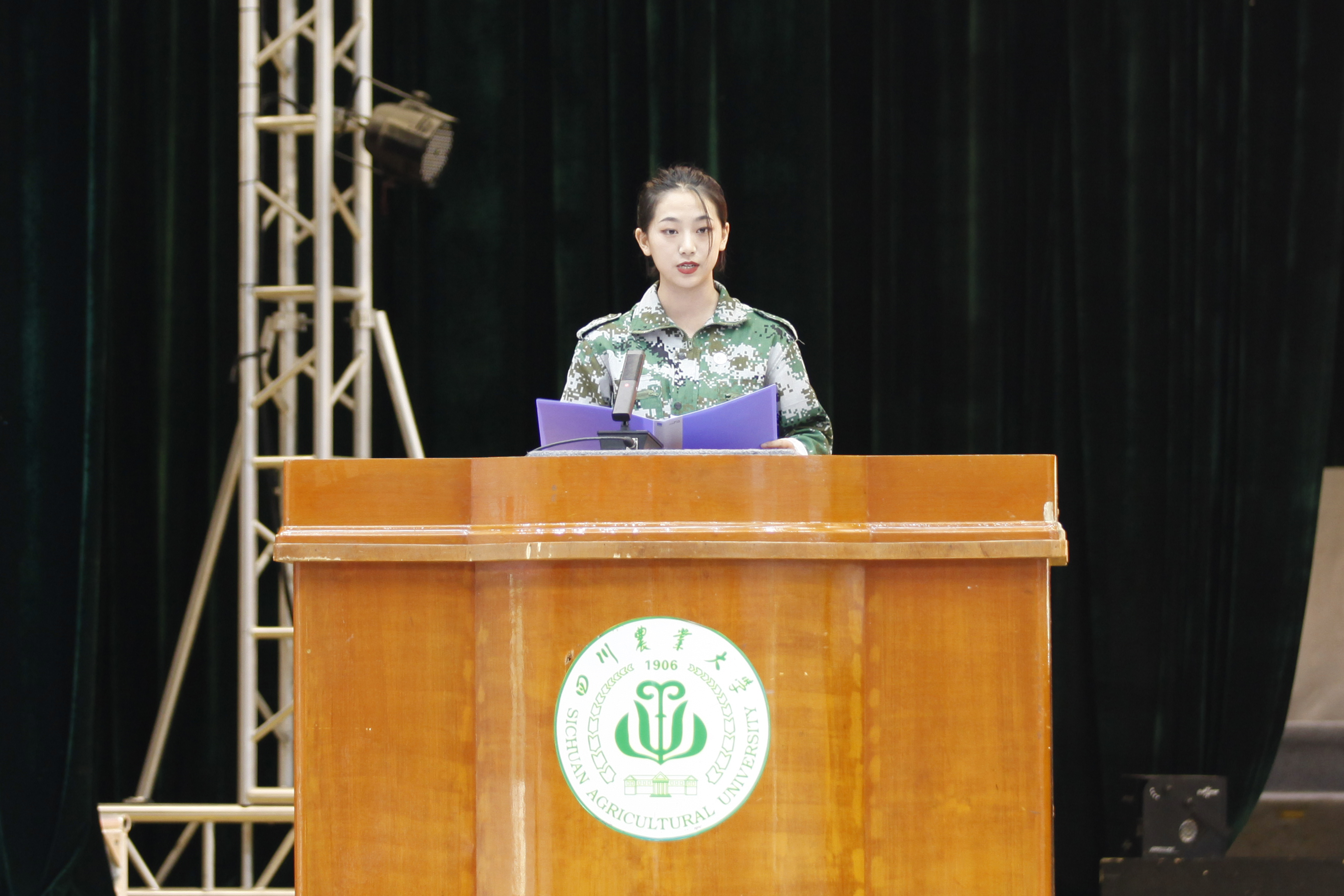 台上就座的领导为新生代表佩戴院徽,全体新生起立自行佩戴院徽。戴上院徽就是川农体育人,要用四年乃至一生去践行院徽背面的学院精神“尚文勤练,积健图强”。