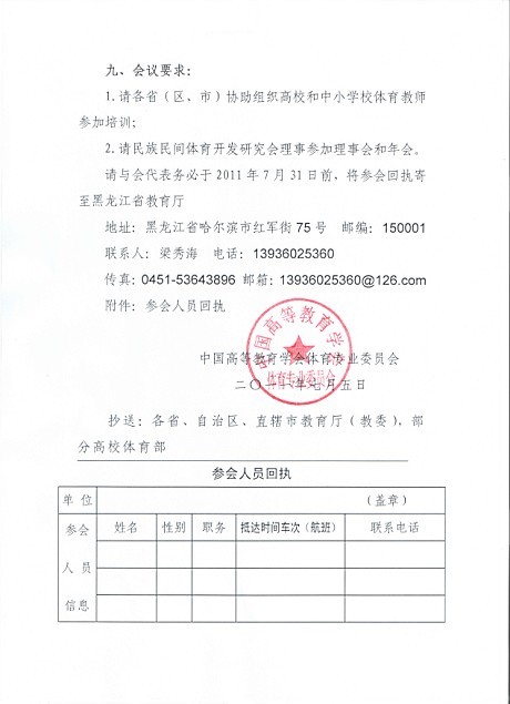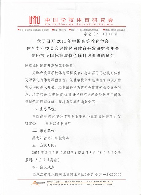 关于召开2011年中国高等教育学会体育专业委员会民族民间体育开发研究会年会暨民族民间体育与特色项目培训班的通知1