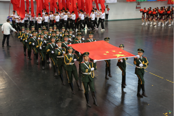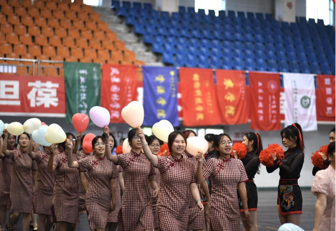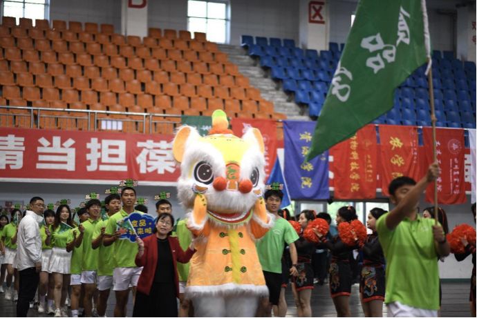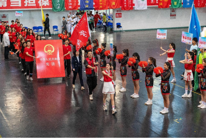 在激扬的运动员进行曲中,国旗队、红旗队、鲜花队、裁判员队及26支代表队依次亮相:有的方阵同学们手持彩旗,活力四射,挥舞出青春的鲜艳色彩;有的方阵同学们身着旗袍,温婉优雅,步履轻盈似蝶;有的方阵带上吉祥物,精致可爱,为开幕式增添了不少趣味性和观赏性……同学们精神抖擞、笑容洋溢,高喊出震耳欲聋的口号,一个个彰显学院特色和青年学子本色的创意方阵引得现场观众欢呼声不断。