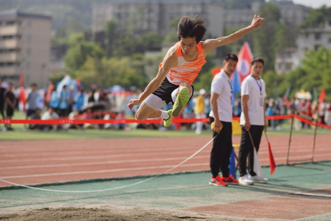 跳远运动员如同离弦之箭,奋力冲向起跳线。他们一跃而起,在空中划出优美的弧线,随后稳稳地落在沙坑之中,溅起一片沙花。
