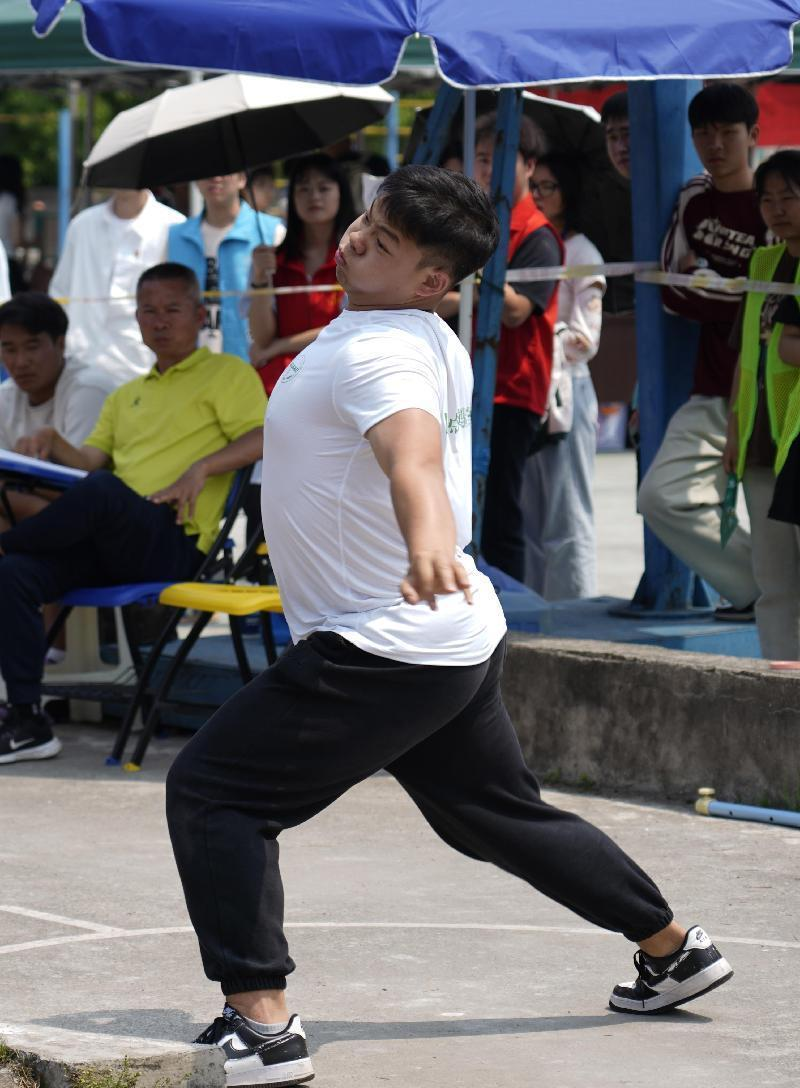 铅球运动员紧握铅球,全身力量凝聚于一点。随着一声怒吼,铅球如同炮弹般划破长空,落地时激起一片尘土。