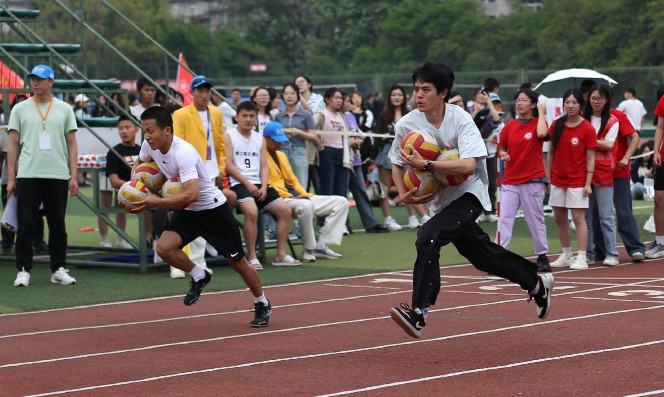 全神贯注,健步如飞,迎面抱球接力!稳稳抱住怀中的球,再稳稳地传递,曾经流过的汗水,此刻在艳阳下溢彩!
