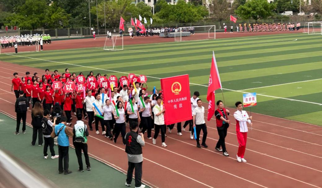 青春律动,法韵飞扬。学院方阵步伐铿锵、昂首挺胸地踏入赛场;高举的宪法典,闪耀着法治的荣光;“以法为纲,修德立长;正义领航,共铸荣光”的字样,传递出学院学子秉持公正、追求法治的坚定决心。
